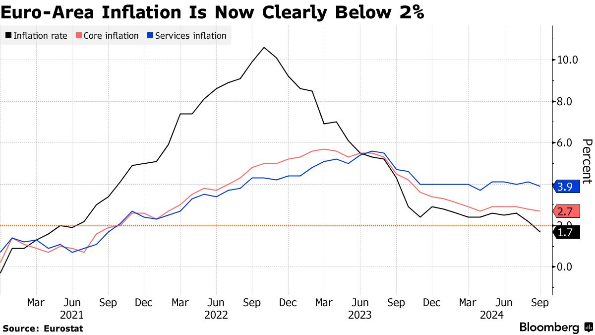 在加快宽松步伐后,行长克里斯蒂娜·拉加德在周四对欧洲央行的下一步行动保持沉默。不过,市场押注于在接下来的几次会议上将进行一系列降息——从12月开始,一些投资者认为可能会有更大幅度的半点降息,因为通胀已经降至1.7%。