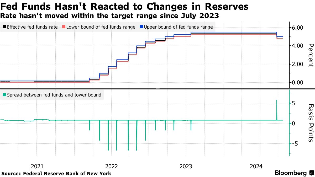 隔夜利率对国债结算的敏感性以及有限的银行贷款在9月底即使利率飙升也显示出可用资金的压力。与此同时,自2023年7月以来,联邦基金利率在美联储的政策利率目标范围内几乎保持不变——尽管货币政策发生了变化——这表明系统中现金的充裕。