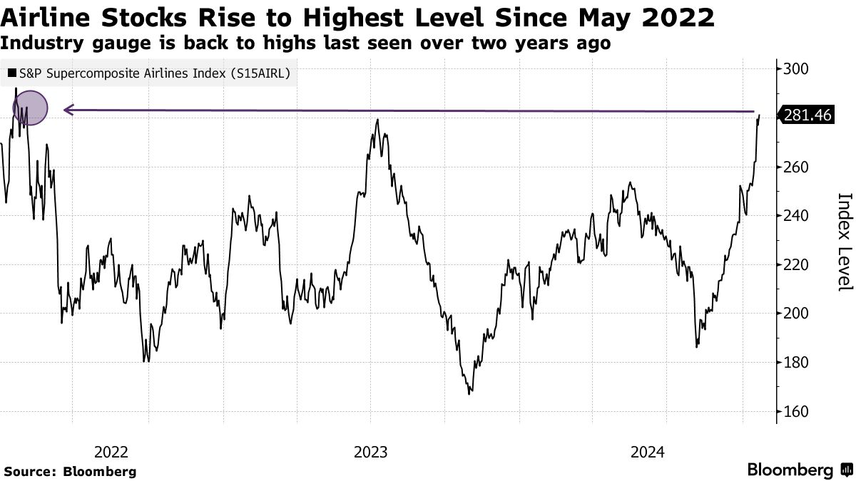 标准普尔超级复合航空公司指数的交易价格达到了自2022年5月以来未见的高点,周五结束时创下自去年1月以来最大的周涨幅。这个九个成员的指数今年迄今甚至超过了更广泛的市场反弹,其32%的涨幅超过了标准普尔500指数的23%涨幅。