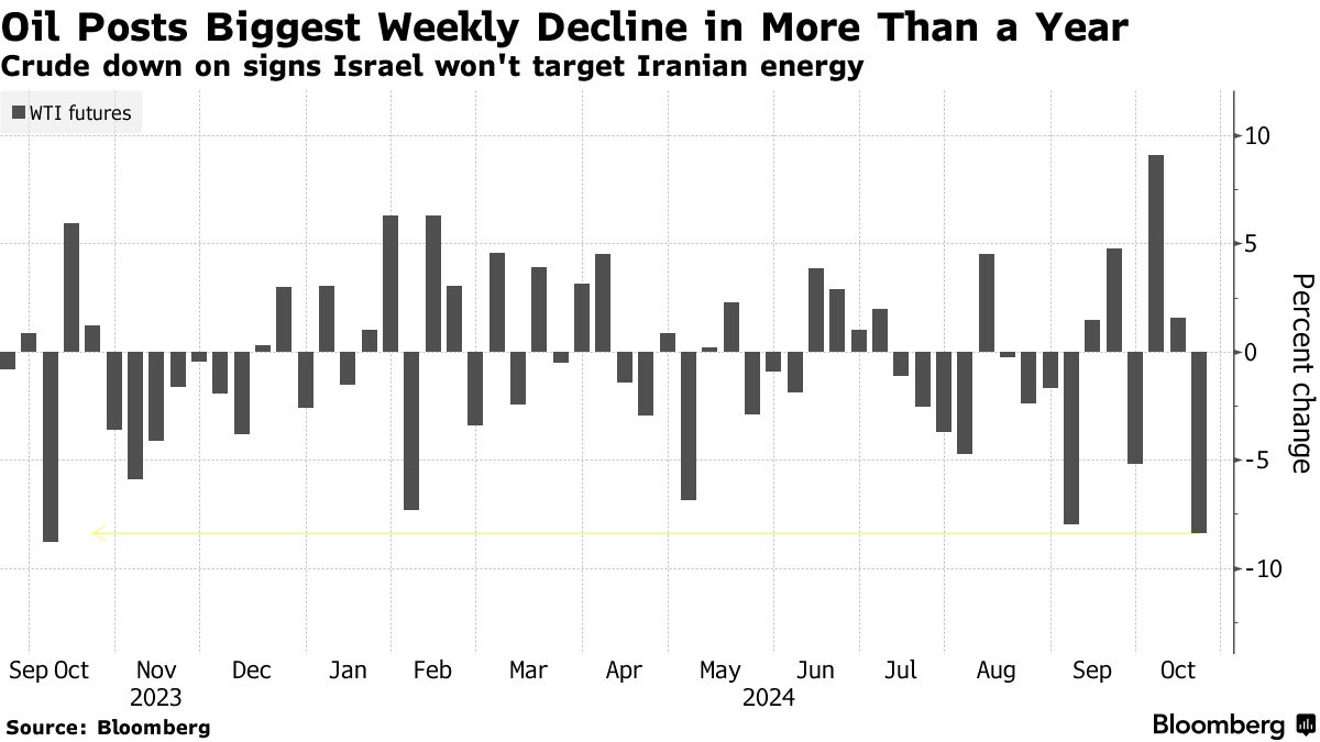西德克萨斯中质油下滑超过2%,收于每桶约69美元,而布伦特回落至每桶约73美元。WTI的周度跌幅为8.4%,是自2023年10月以来的最大跌幅。以色列杀害哈马斯领导人雅赫亚·辛瓦尔导致美国总统乔·拜登重申停火呼吁,尽管总理本杰明·内塔尼亚胡表示行动“尚未完成。”