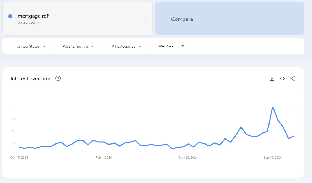 谷歌趋势所以,是的,剧透警告,最近人们搜索抵押贷款再融资的高峰出现在9月18日,那天美联储将利率下调了50个基点。