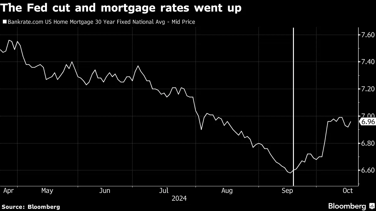当然,这里的反常之处在于,降息的时机恰好是抵押贷款利率市场的最近底部。自那时以来,30年期固定利率抵押贷款的成本一直在上升,目前徘徊在7%以下。