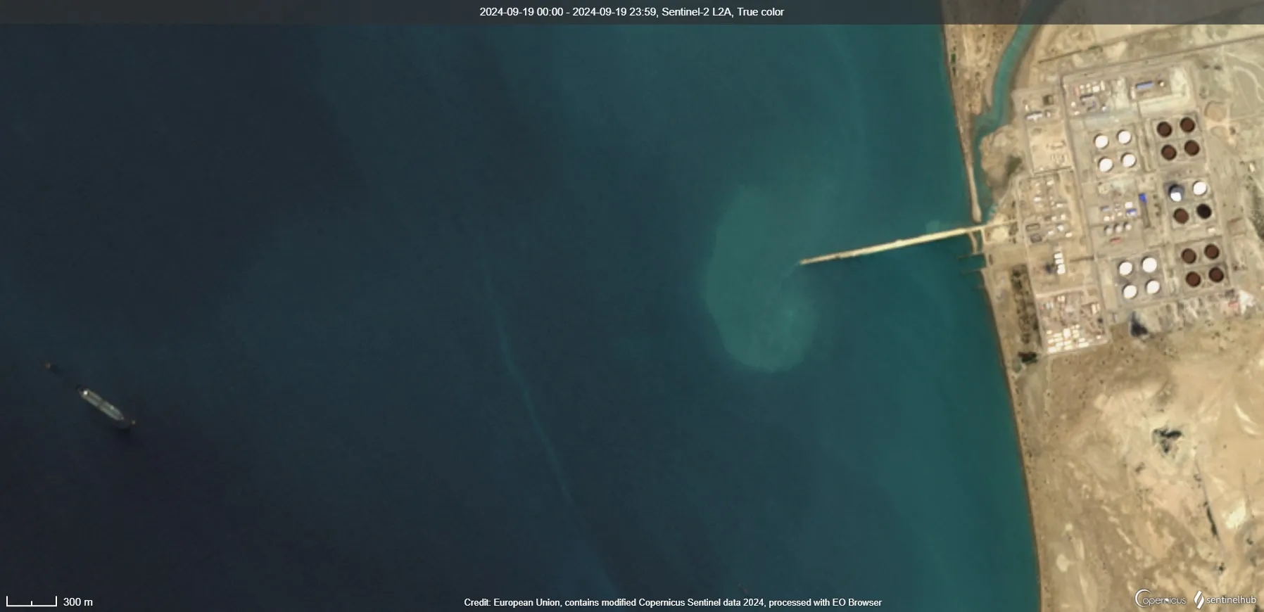 2024年9月19日,VLCC Dune停靠在伊朗贾斯克石油出口终端,位于霍尔木兹海峡来源:从EO浏览器获得的Sentinel数据根据彭博社审查的卫星图像,在2021年正式开幕时,确实有两艘小型油轮出现装载,但这一壮举直到上个月才再次出现。