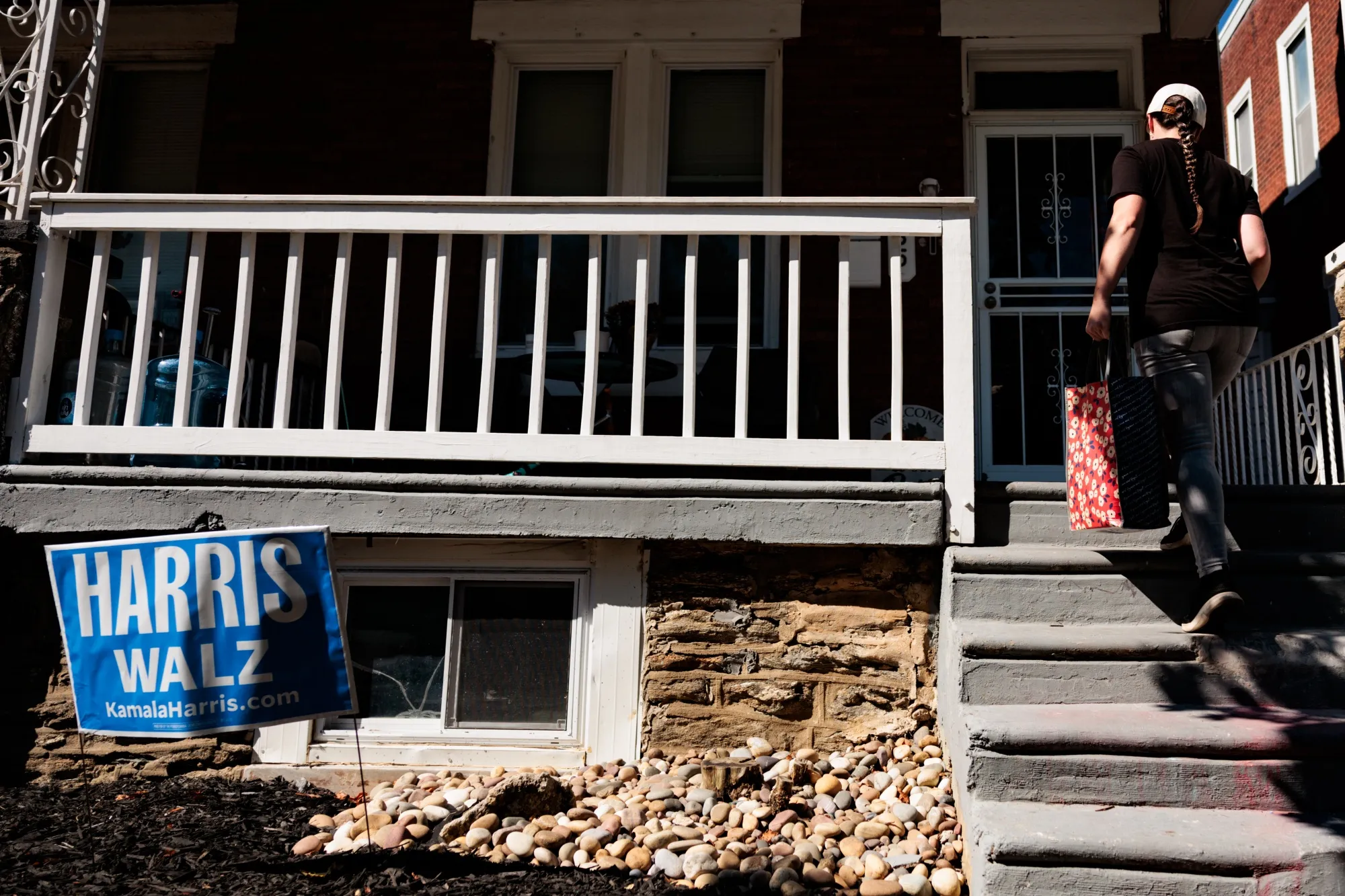 哈里斯和沃尔兹在费城一所房子外的竞选活动。摄影师:汉娜·贝尔/彭博社为了寻找任何动机让吉尔斯去投票,那里他更有可能投票给哈里斯而不是特朗普,多霍尼提到了当地一位工人家庭党议员及其保护城市租户免受歧视的努力。