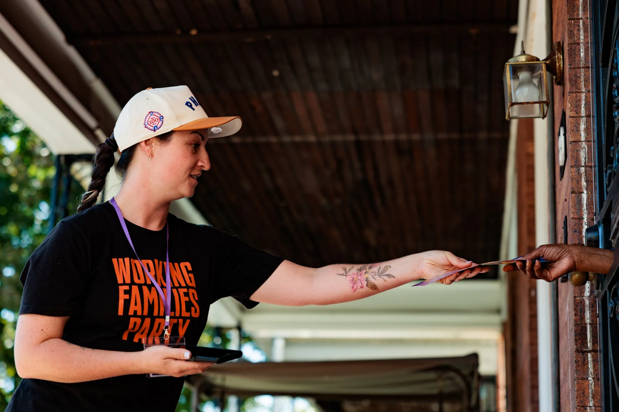 工人家庭党志愿者埃琳·多霍尼在费城将哈里斯-沃尔茨竞选宣传册递给一位居民。