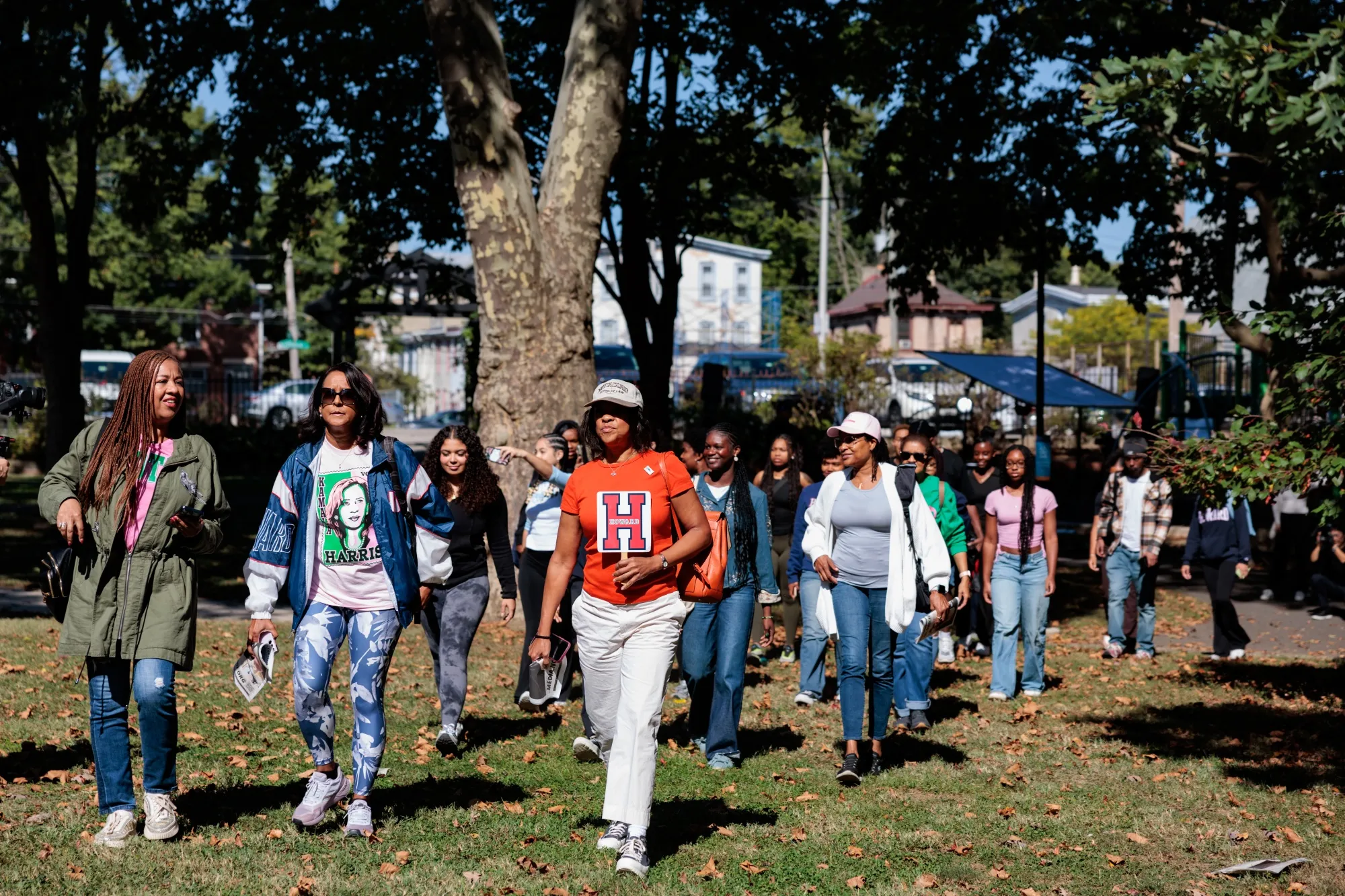 霍华德大学的校友和在校学生抵达弗农公园,加入工作家庭党,为卡马拉·哈里斯和蒂姆·沃尔兹在费城进行拉票。摄影师:汉娜·贝尔/彭博社宾夕法尼亚州对哈里斯赢得总统职位的几乎所有路径至关重要。哈里斯竞选团队表示,上周末志愿者和工作人员在该州敲响了250,000扇门;他们计划在选举日临近时加快步伐。