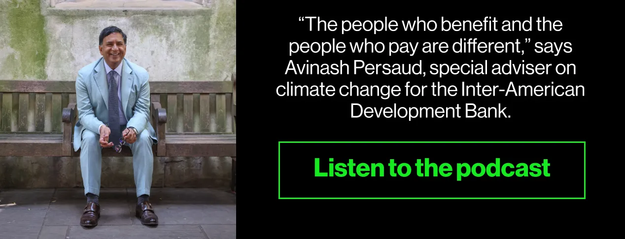 美洲开发银行气候变化特别顾问阿维纳什·佩尔苏德在职业生涯中一直在寻找使全球市场运作以将这笔资金转移到需要的地方的方法。他表示,最大的挑战源于一个简单的现实:“受益者和支付者是不同的。”