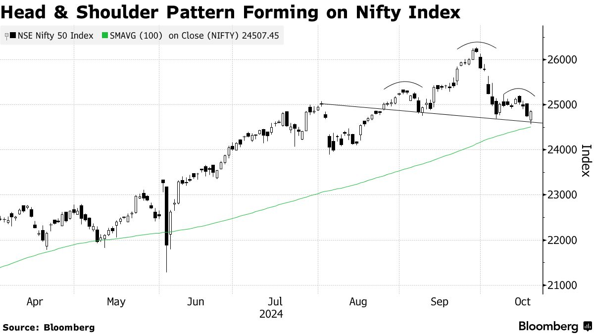 从技术面来看,股市多头的前景也显得黯淡。Nifty正在形成所谓的“头肩顶”形态,这通常预示着可能的趋势反转。在连续三周的亏损之后,人们担心如果趋势线跌破形态的“颈线”,可能会预示着进一步的下行风险。目前,大家都关注100日移动平均线,这在过去曾作为Nifty的支撑位。