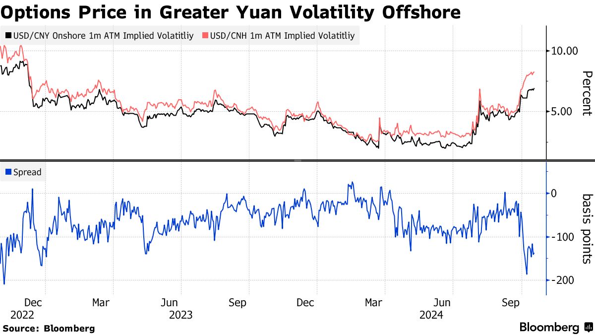 根据彭博社编制的数据,基于期权的境内人民币一个月隐含波动率指标的交易价格接近自2022年以来对其境外对应指标的最大折扣。部分原因似乎是当地交易员更有信心中国人民银行将帮助限制人民币波动,即使选举结果由威胁提高对中国商品关税的唐纳德·特朗普赢得。
