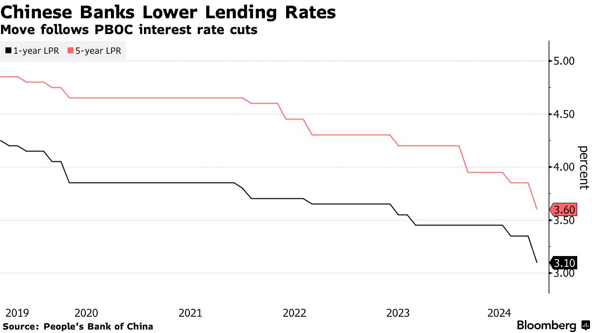 贷款市场报价利率的下调——由一组大型中国银行设定——是在中国人民银行上个月概述的鼓励家庭和企业借款的措施之后进行的。这些措施包括降低利率和释放流动性以鼓励银行放贷。
