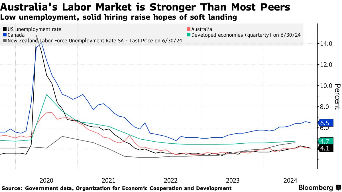 支撑经济整体需求的数据上周显示,该国的强劲招聘势头延续至9月,失业率保持在4.1%的稳定水平。澳大利亚的劳动力市场表现优于其他发达国家同行,那里的紧缩货币政策使失业率大幅上升。