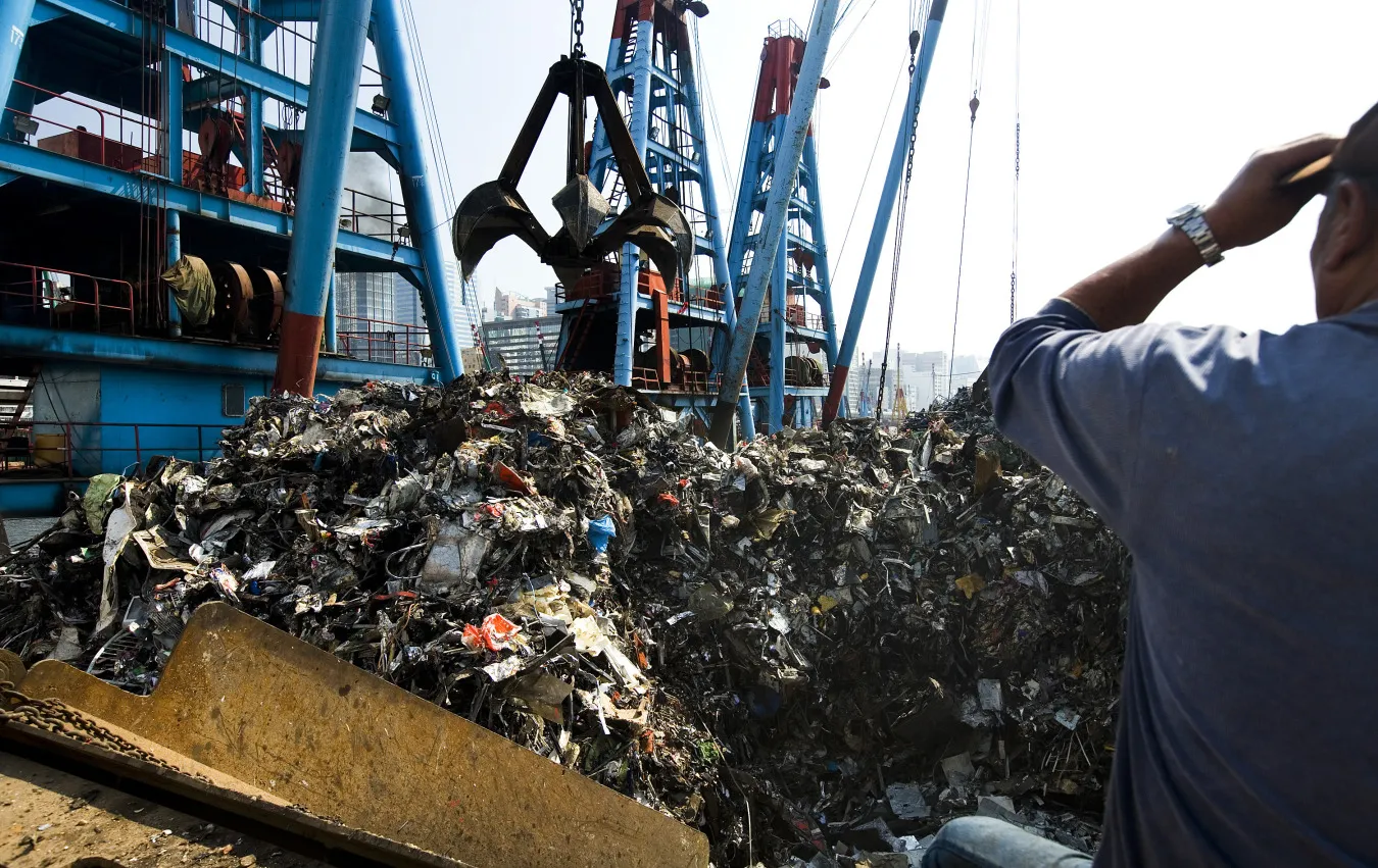 废金属正在香港装载到驳船上。
