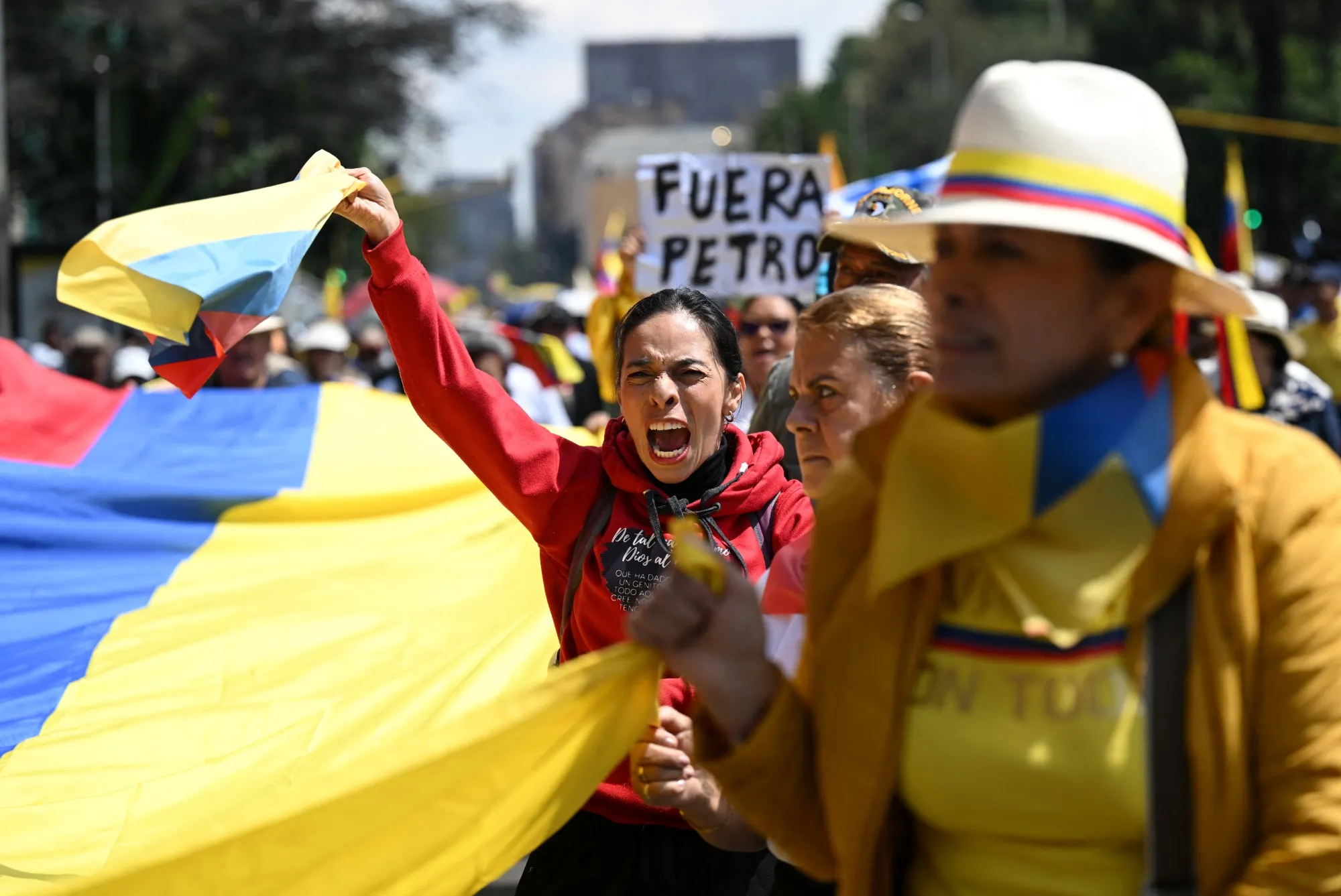 一名示威者在2024年3月6日于波哥大举行的反对哥伦比亚总统古斯塔沃·佩特罗政府的游行中高喊口号,抗议健康和养老金改革。