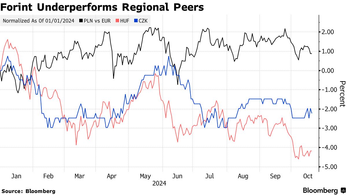 “持有对福林的空头头寸不再昂贵,而匈牙利国家银行暂停降息也并没有太大威慑力,”罗森格伦说。“投资者将准备迎接更高的风险溢价和更弱的福林。”