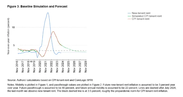 克利夫兰联邦储备银行的一项 模拟模型 试图捕捉这一差距,使用来自租户流动性数据、新租户支付的租金以及新租户租金变化传递给继续租户的速率的输入。