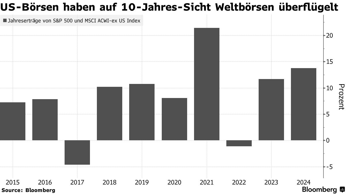 在全球金融危机之后,美国股市经历了一波反弹,最初是由于接近零的利率,后来又因对强劲经济增长的押注。根据彭博社的数据,2024年标准普尔500指数有望在过去十年中八次超越全球其他市场。