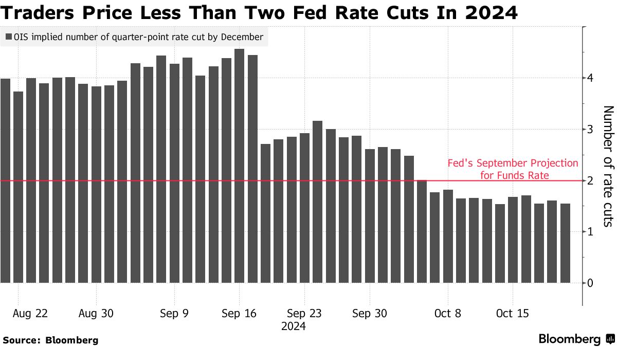 掉期交易员预计美联储在11月会议上将降息21个基点,低于完整的四分之一点。对于今年最后两次美联储会议,仅定价42个基点,这提高了中央银行跳过一次会议的可能性,这一观点在九月份强劲的就业报告发布后得到了支持。