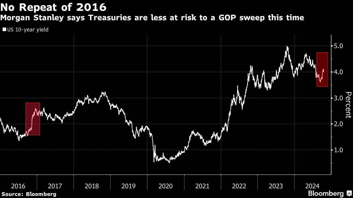 这次,特朗普正在以一个 类似的平台 进行竞选,向一些投资者表达 担忧,认为这可能会加剧通货膨胀并恶化美国的财政状况。然而,摩根士丹利认为,类似于2016年利率前景的上调是不太可能的。市场目前预计到明年年底将有约140个基点的降息。