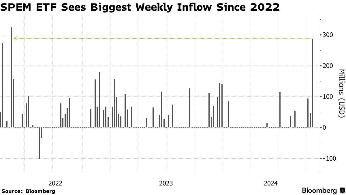 SPDR投资组合S&P新兴市场ETF在中国、印度和台湾的配置也看到了强劲的资金流入。该基金以其代码SPEM而闻名,记录了2.87亿美元的新资金,这是自2022年以来最大的周增幅。