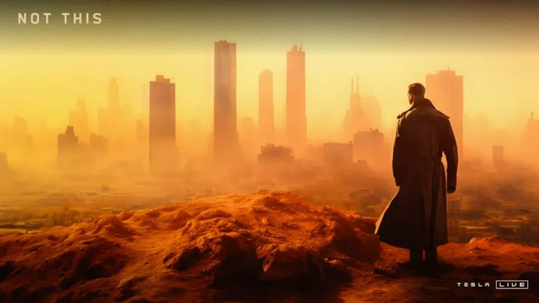 演示中包括一张AI生成的图像幻灯片,类似于电影中的一个镜头,瑞安·高斯林的角色望向一个末世的世界。来源:X/特斯拉马斯克长期以来提到 银翼杀手,这是一部1982年的经典科幻电影,讲述了一个反乌托邦的未来和环境崩溃。当谈到特斯拉的Cybertruck时,他曾表示希望设计“一个真正未来感的赛博朋克‘银翼杀手’皮卡”,并在2019年 分享了电影开头字幕的链接。银翼杀手2049 是原电影的续集。