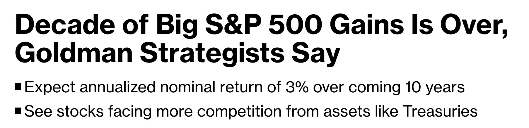 信不信由你,这些头条新闻相隔不到一个月。那些同样的高盛策略师说标准普尔500指数将迎来另一个辉煌的年份,同时也表示该指数在未来十年内每年仅会以名义增长3%(实际增长1%)——这是历史最低。“同时预测一个已经强劲的市场将在接下来的12个月表现出色,而在接下来的10年表现不佳,确实暗示了一个不可持续的状态,甚至可能是一个泡沫,”约翰警告道。谁知道它可能会在何时破裂。