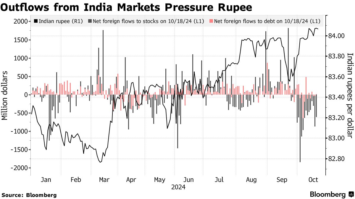 全球基金本月从印度股票中撤回了91亿美元,原因是估值昂贵以及转向中国。即使是印度的指数合格债券,自6月纳入全球债券指数以来,每月吸引约20亿美元的资金流入,本月也经历了连续两周的资金流出。