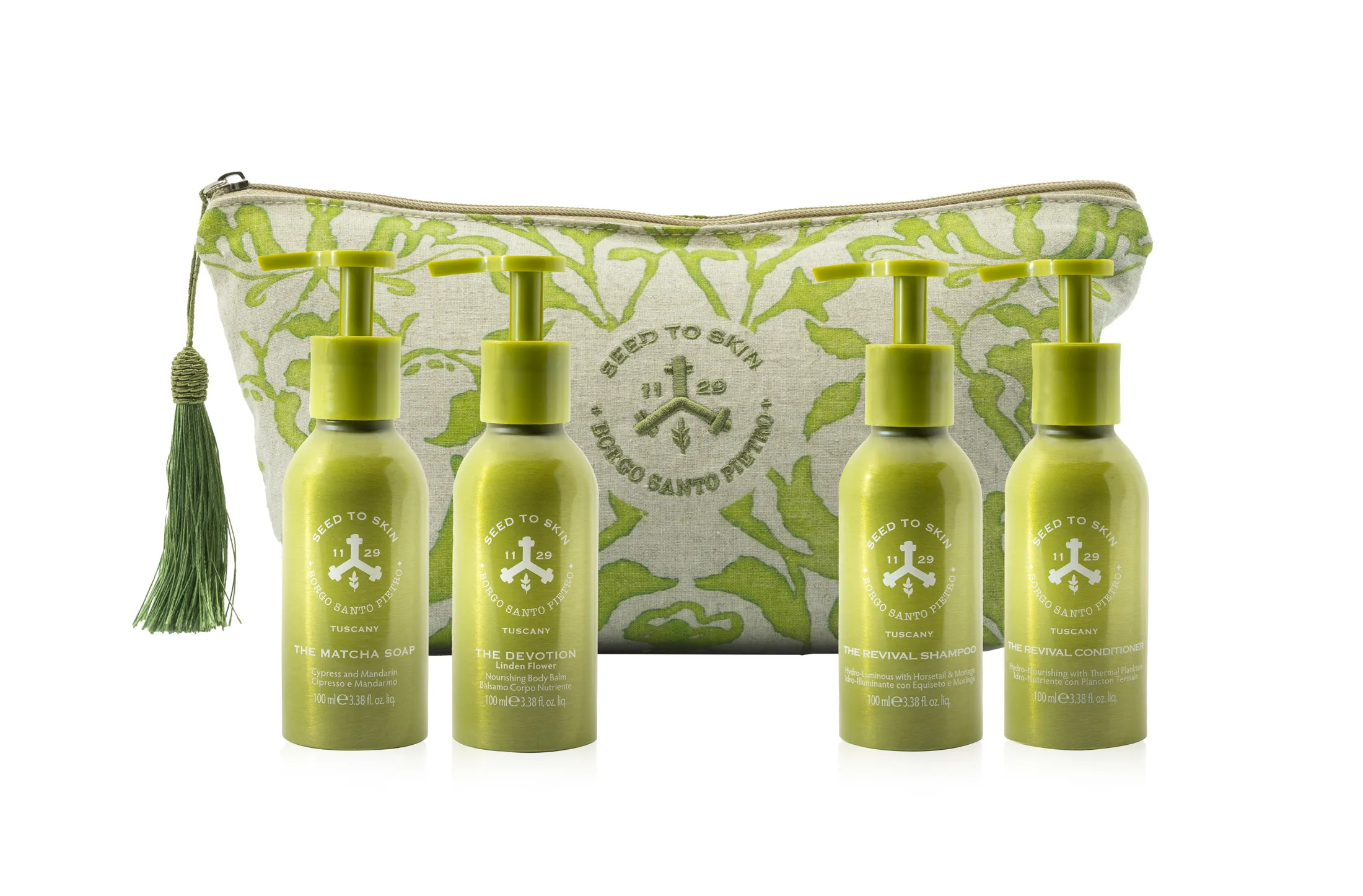 Seed to Skin的旅行伴侣套件。冒险的气息使用 Seed to Skin 新推出的207美元旅行伴侣套件,仿佛置身于意大利乡村。托斯卡纳的 博尔戈圣彼得罗 酒店的老板——一个拥有300英亩橄榄树林和农场的广阔庄园——提供了一款旅行装洗发水,带有佛手柑、迷迭香和柠檬的香气,一款含有热带浮游生物的护发素,以及一款由抹茶制成的肥皂。(将于11月1日上市)
