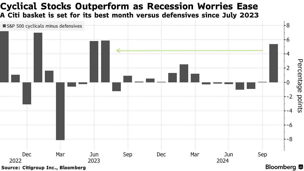 一篮子周期性股票在十月份的表现超过了其防御性同行,这是自2023年7月以来的最大差距,得益于强劲的宏观前景。不过,该组股票在进入财报季时遭遇了收益下调的重创。分析师们还预计,所谓的“七大科技巨头”的收益增长将出现明显的环比放缓。