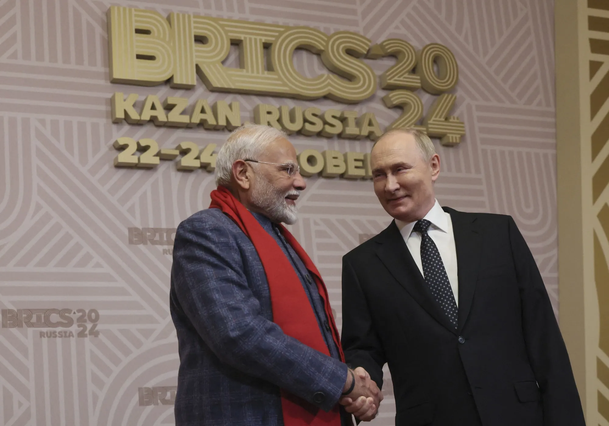 弗拉基米尔·普京(右)在10月22日迎接纳伦德拉·莫迪。摄影师:马克西姆·希彭科夫/法新社/盖蒂图片社世界上两个最多人口国家的领导人在为期三天的金砖国家峰会期间分别会见了俄罗斯总统弗拉基米尔·普京,这是自他在2022年2月下令全面入侵乌克兰以来,俄罗斯举行的最大规模的世界领导人聚会。