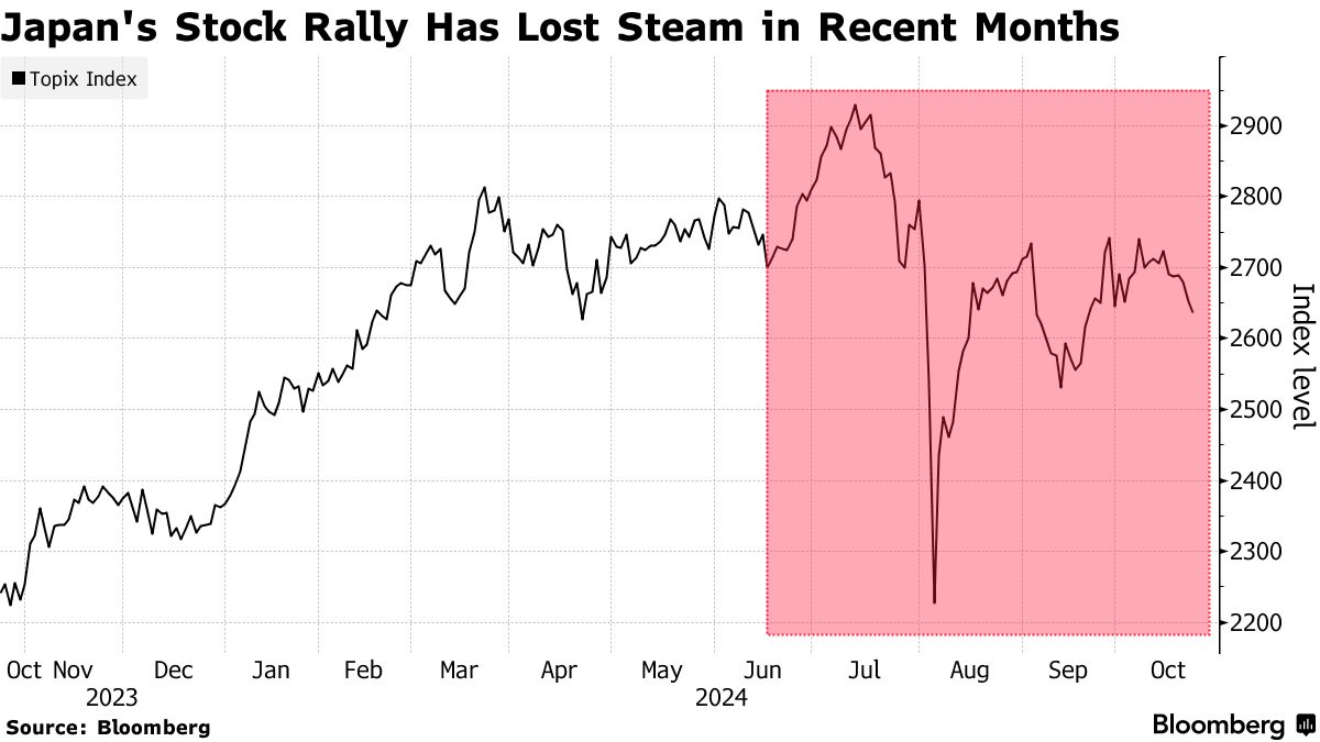 尽管日本股市在最近几个月的反弹有所减弱,但这一呼吁仍然发出,原因是对新任首相石破茂的政策优先事项的质疑,以及日元价值的波动可能会压缩该国出口商的利润。东证指数自7月份的高峰以来下跌了约10%,而外国投资者在今年早些时候的买入狂潮后已退缩。