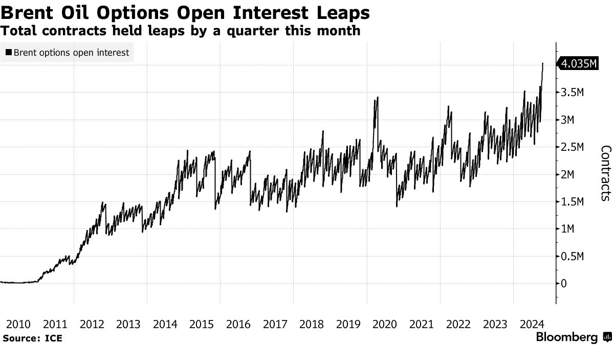 布伦特期权的未平仓合约本周首次超过400万份——相当于40亿桶。交易商持有的总头寸在本月迄今已增长超过25%。