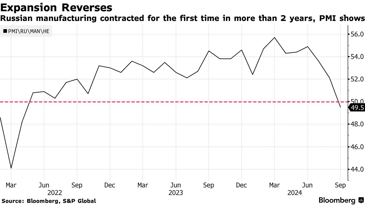 根据标普全球采购经理人指数,俄罗斯制造业在九月份自2022年四月以来首次收缩。俄罗斯经济部本月表示,八月份经济年增长率为2.4%,主要是由于收获期的延迟,本月。这是自普京总统在2022年入侵乌克兰后立即出现的衰退以来的最低水平。