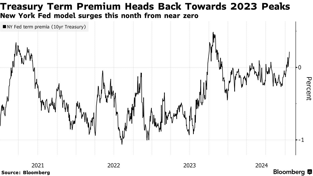 美国财政部“期限溢价”回升至2023年峰值 - 彭博社