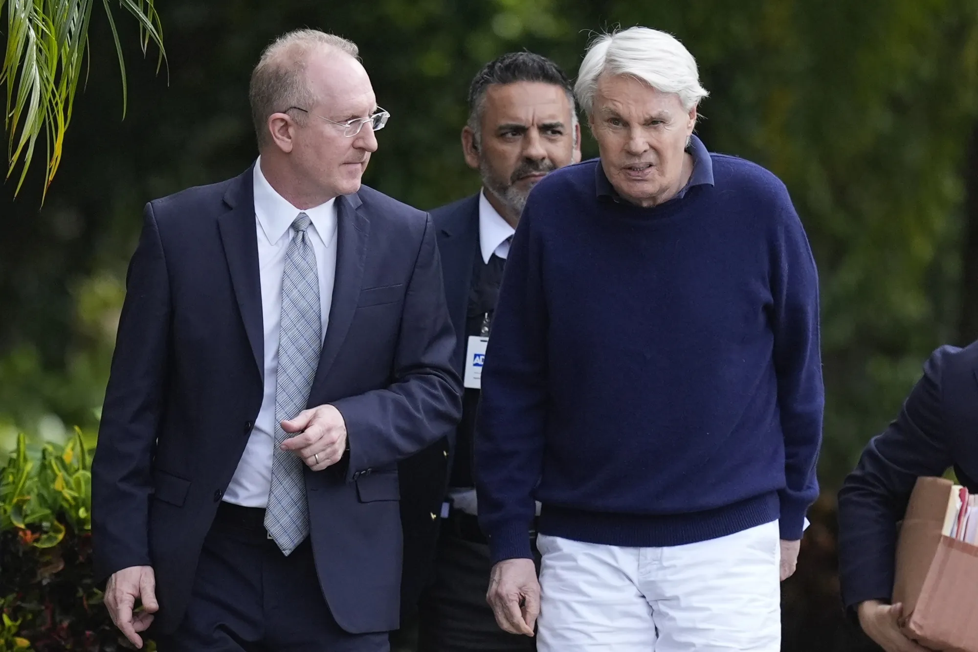 迈克尔·杰弗里斯(Michael Jeffries),右侧,和他的律师在佛罗里达州西棕榈滩的保罗·G·罗杰斯联邦大楼和美国法院听证会后离开,日期为10月22日。