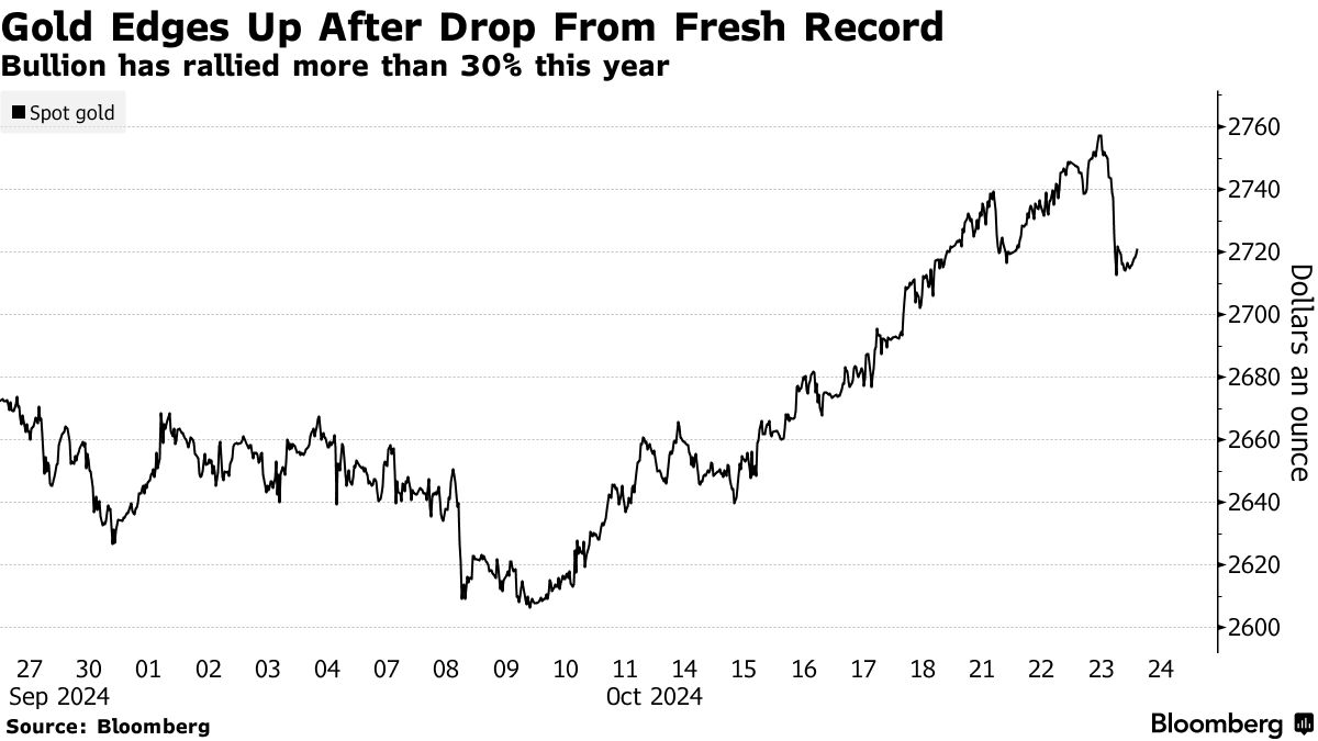 黄金在每盎司约2,720美元附近交易,此前在周三从历史高点回落,结束时下跌1.2%。这一回调是因为技术指标显示最近的反弹可能过于强劲,14天相对强弱指数显示该金属被超买。