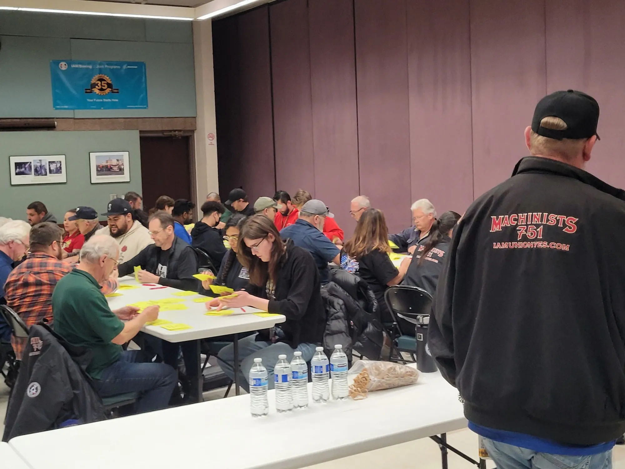 国际机械师和航空航天工人协会第751区的成员们在华盛顿州西雅图的工会大厅对与波音公司的提议合同进行投票。摄影师:斯宾塞·索珀/彭博社波音公司的工厂工人拒绝了一项新的 劳动合同,该合同将在四年内将他们的工资提高35%,这对正在努力克服严重停工的波音公司来说是一次打击。