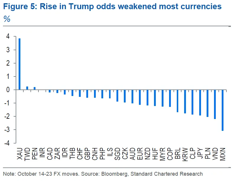 很难将收益率的上升归咎于那些因赤字上升而担忧的臭名昭著的债券警卫,因为这自然会伴随着美元的抛售,随着收益率的上升而发生。这正是两年前英国国债危机期间发生的情况,较高的收益率并未能保护货币不至于跌至历史低点。情况并非如此。特朗普预测市场赔率的大幅上升恰好是在本月的就业数据发布后开始的。标准 Chartered Plc 的史蒂文·英格兰德在下方绘制了自那时以来一系列货币对美元的变化。除了金子外,它们都在贬值。受影响最严重的是那些预计将从公司将生产转移出中国中受益最多的国家,如越南和墨西哥,因为特朗普现在似乎决心阻止这一点: