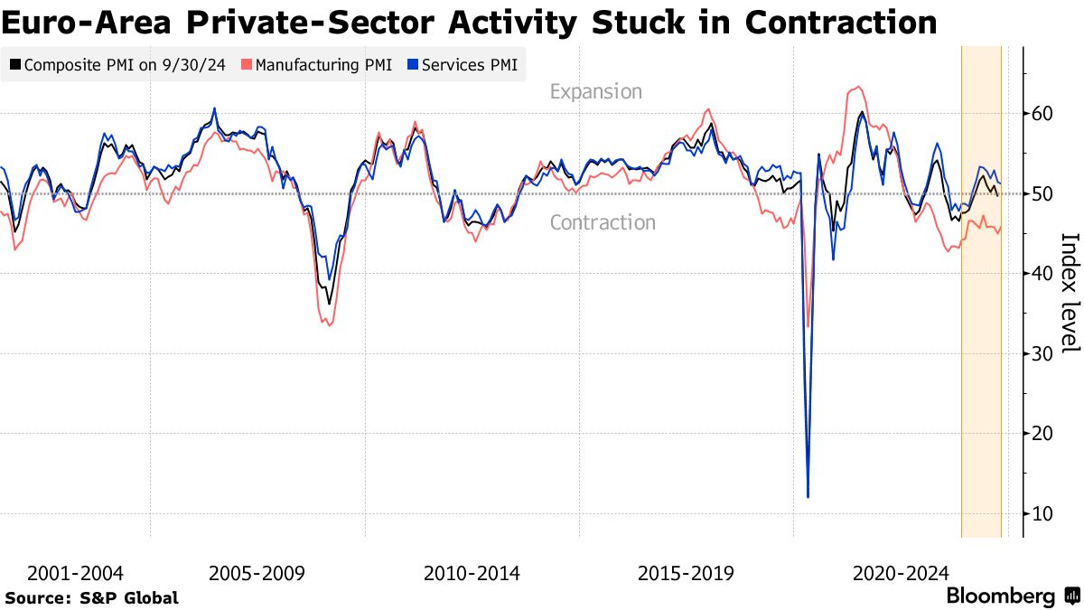 这种疲软在欧洲中央银行敲响了警钟,该行上周第三次降低了今年的利率,标志着这一周期首次连续降息。危险在于,低于标准的扩张可能使通胀保持在2%的目标以下。