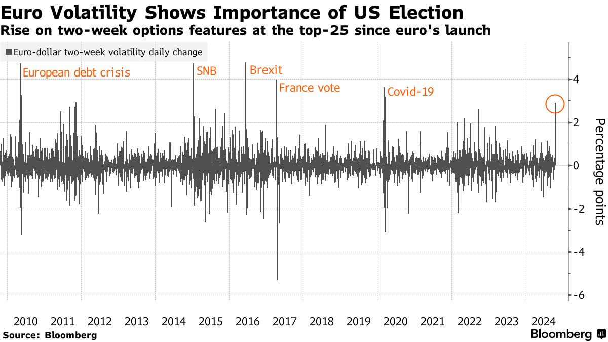 隐含波动率——未来货币波动的一个指标——在周三创下自欧洲主权债务危机以来的第八大日涨幅。那一天,针对未来两周货币的期权押注首次捕捉到即将到来的美国投票。这一波动也是有记录以来的第25大波动之一。