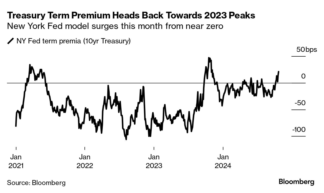 当前热门的指标是****期限溢价的激增,通常被描述为投资者要求持有长期国债而不是滚动短期国债所需的额外收益。虽然这是一个深奥的指标,并且只能估算,因为没有办法看到10年期国债的平均收益率,但它仍然是衡量债券市场风险的重要指标。