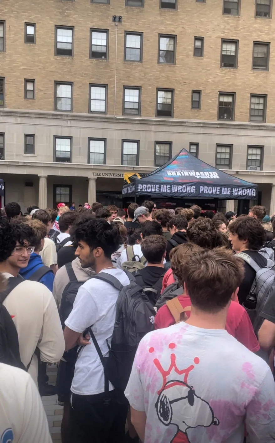 一名学生告诉我们,“我”是查理·柯克,一个年轻的保守派活动家和挑衅者,他正在进行一场“你正在被洗脑”的大学校园巡演。在这一站,他带来了企业家转变为共和党总统候选人的维韦克·拉马斯瓦米。面对一位MAGA名人的诱惑,学生们无法抗拒,最终有些人出现在尴尬的视频中。这,当然,就是整个事件的目的。