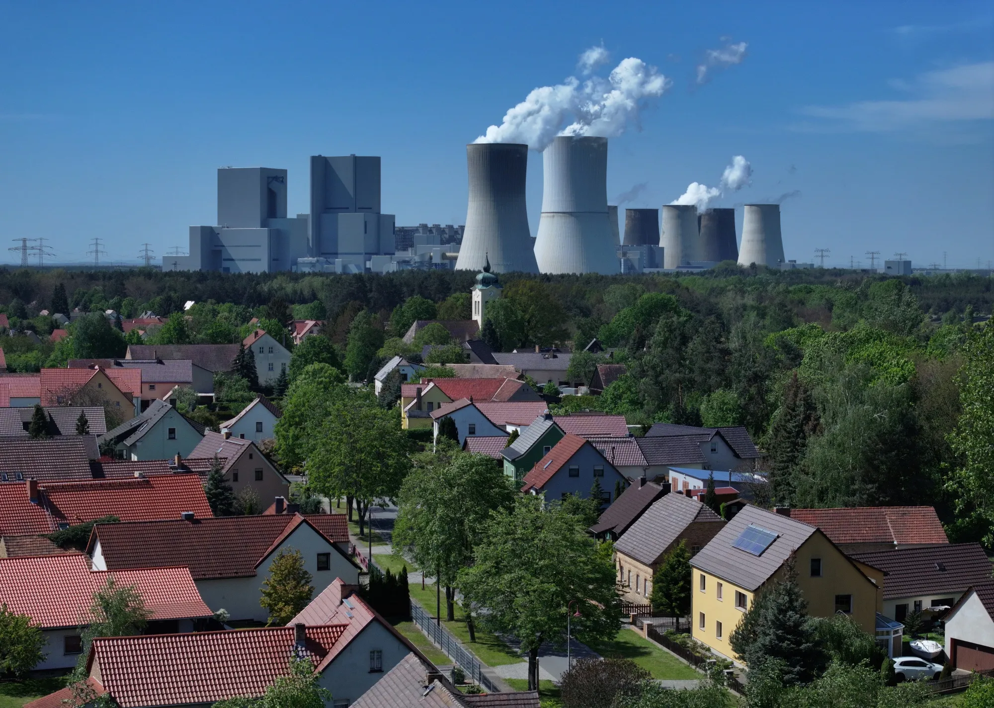 德国诺赫滕的房屋后面矗立着博克斯贝格燃煤电厂。