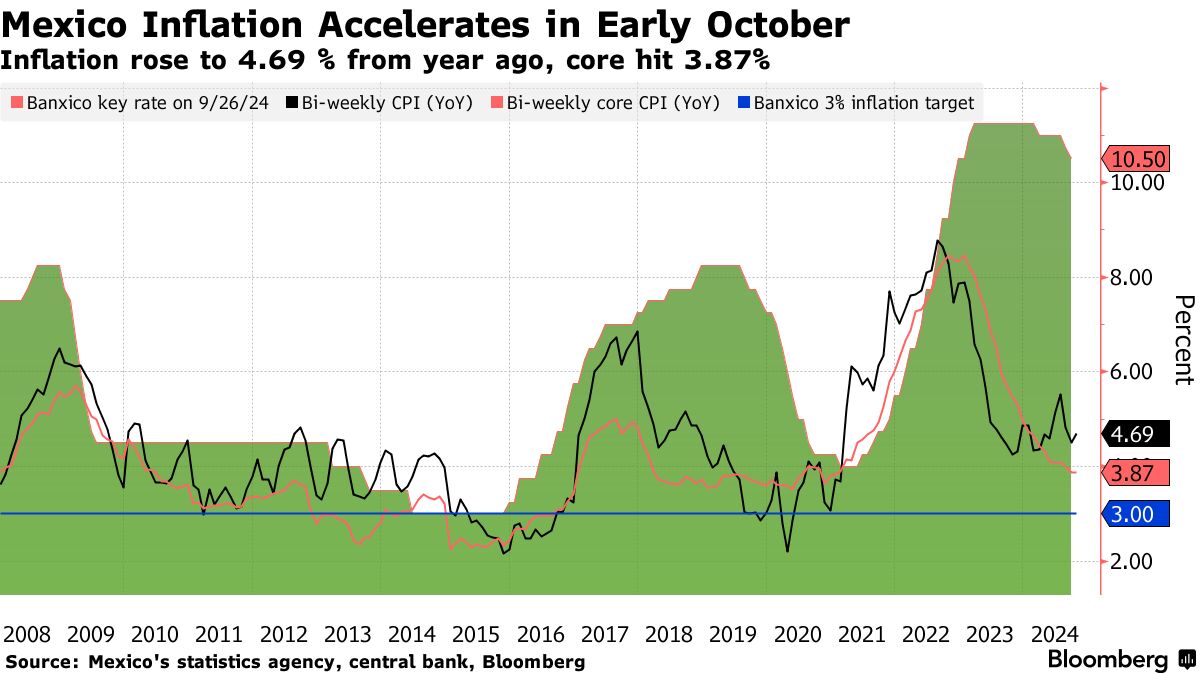 墨西哥的通货膨胀在十月初加速,超出预期,这可能会使中央银行下个月继续降低基准利率的计划变得复杂。