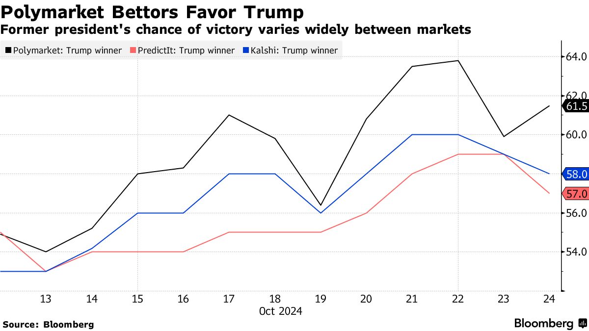 对总统选举结果进行投注是总部位于纽约的Polymarket最受欢迎的产品,今年该市场的交易量接近24亿美元。截止到周四,特朗普获胜的隐含概率在Polymarket上为61.6%,而竞争对手Kalshi为59%,PredictIt为57%。