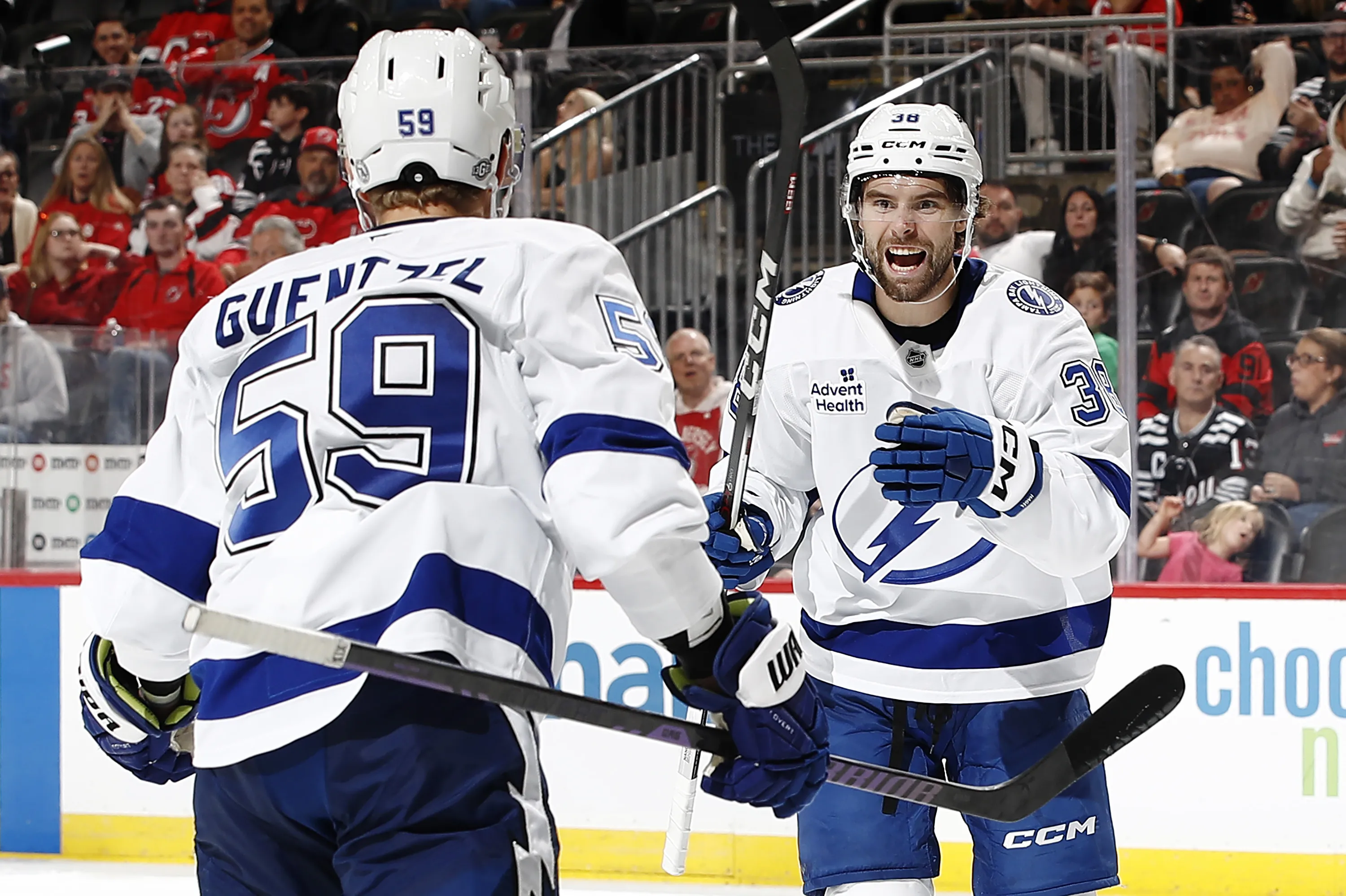 布兰登·哈格尔在新泽西州纽瓦克,10月22日,在对阵新泽西魔鬼队的第三节中,和坦帕湾闪电队的杰克·根特尔庆祝进球。
