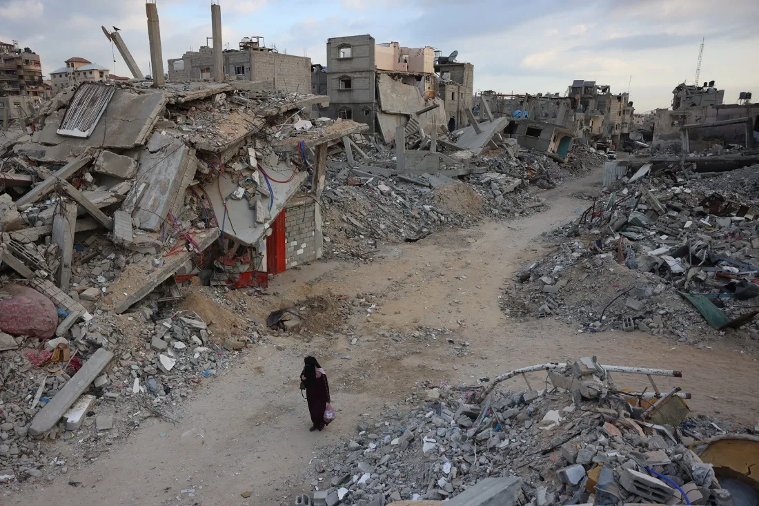 一名女性在加沙的汗尤尼斯走过被毁坏的建筑,时间是10月17日。