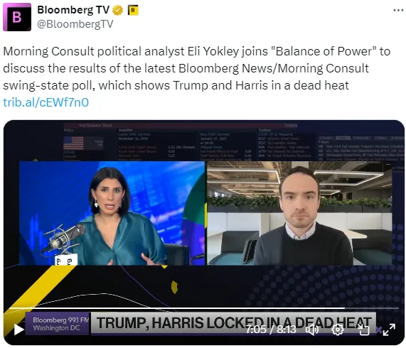 今天在彭博电视台的 权力平衡早间版中,主持人乔·马修和凯莉·莱因兹采访了晨咨询的政治分析师伊莱·约克利,讨论最新的彭博新闻/晨咨询摇摆州民调。