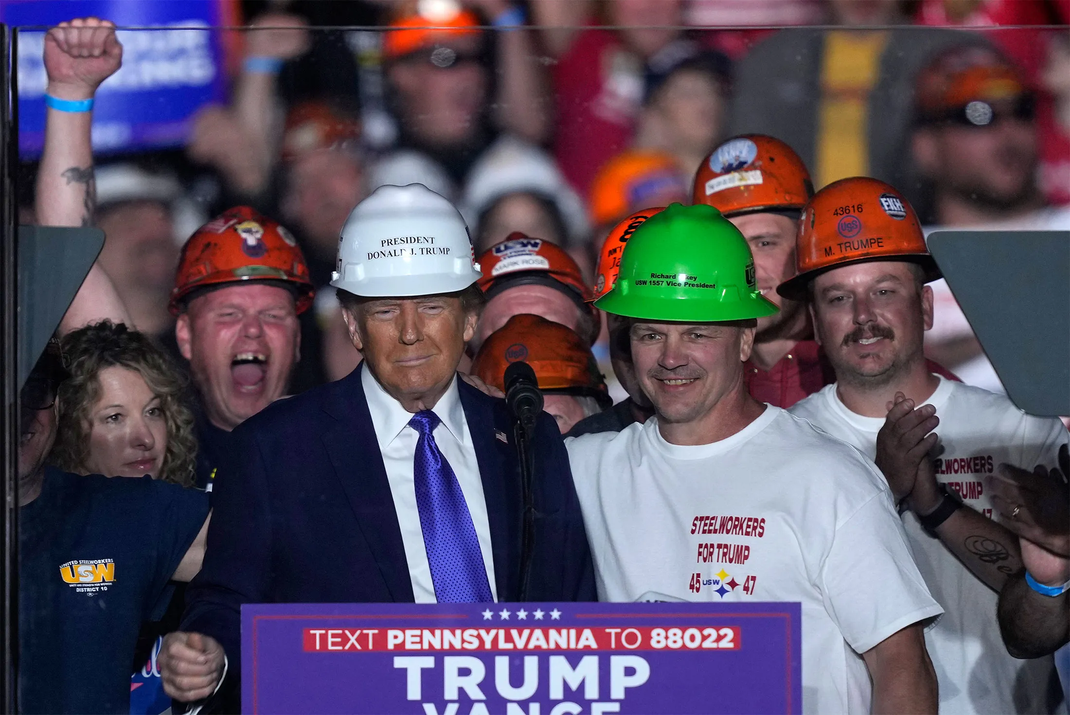 唐纳德·特朗普在宾夕法尼亚州拉托布的竞选集会上与钢铁工人同台。摄影师:马特·鲁尔克/AP照片麦考尔为哈里斯助选是民主党与工会领导层之间持久关系的标志,即使特朗普在一些工人中取得了进展。这种动态导致例如团队工会选择弃权不支持。对哈里斯的支持是在美国钢铁工会成员中对领导层立场出现异议的迹象中出现的,例如一群美国钢铁工人在10月19日的宾夕法尼亚州竞选集会上与特朗普同台。