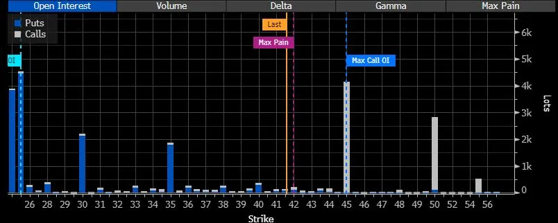 卡普里10月25日到期的看跌期权按行权价的未平仓合约来源:彭博社截至周四,几乎有4500个看跌期权未平仓——允许持有者以25美元的价格购买45万股。当天有超过2300个合约成交,其中包括在最后10分钟内以每个5-10美分的价格成交的600个合约。