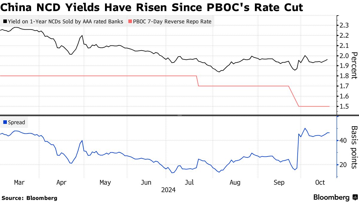 “最近NCD发行成本的上升显示出大型银行持续需要筹集债务并改善其流动性指标,”华西证券的分析师在一份报告中写道。“由于大型银行是首批削减存款利率的银行,并且在第四季度将面临潜在的政府债券供应压力,NCD利率在短期内可能会保持在高位。”
